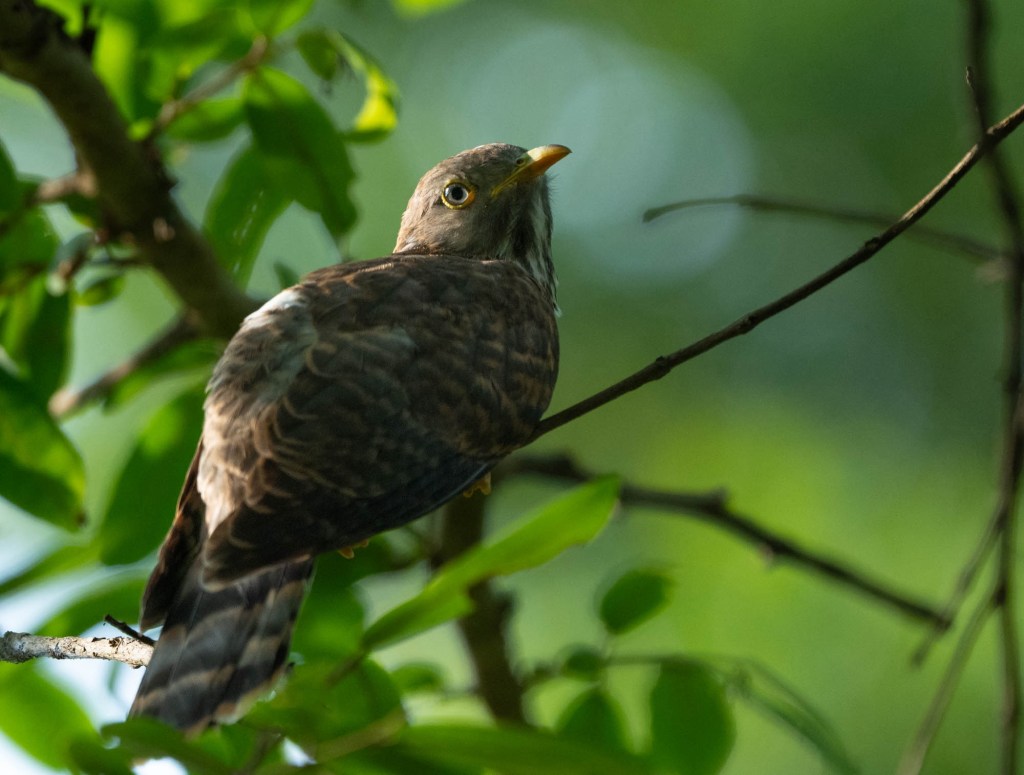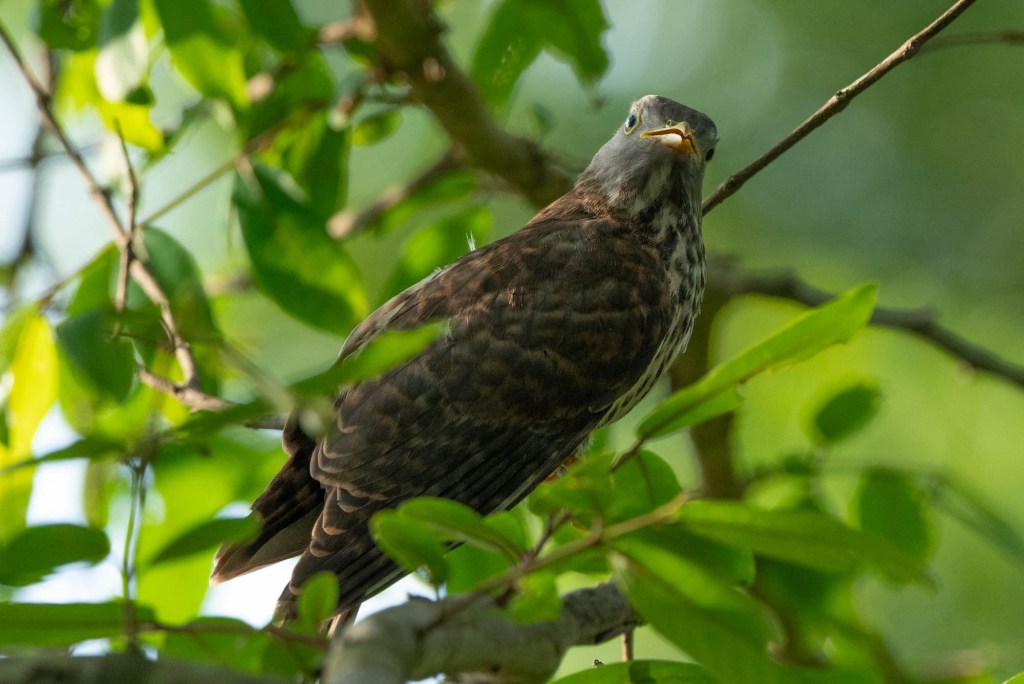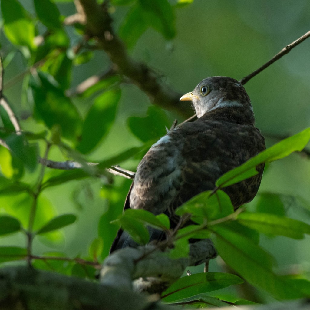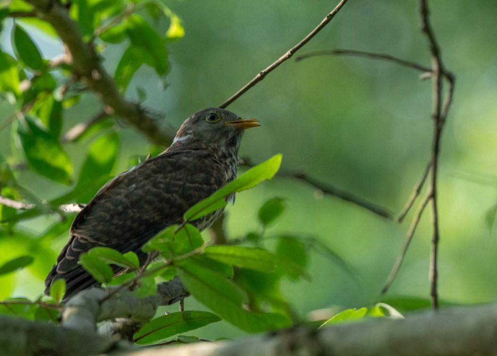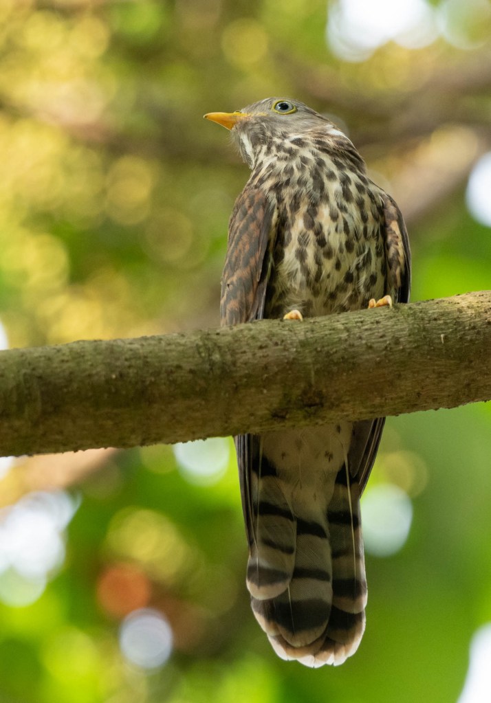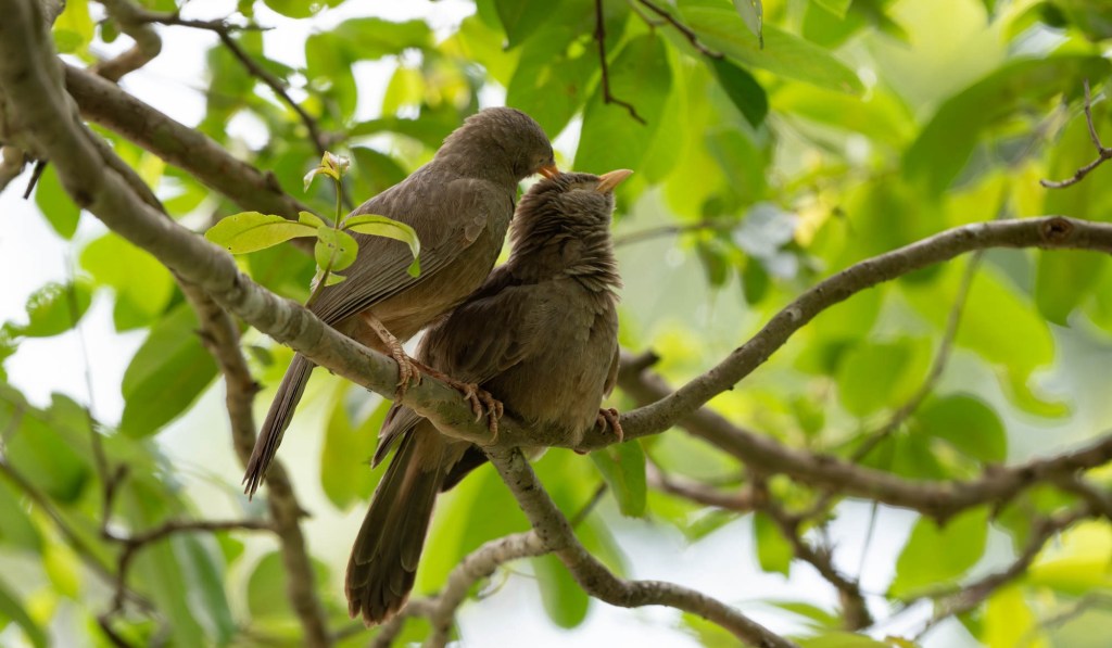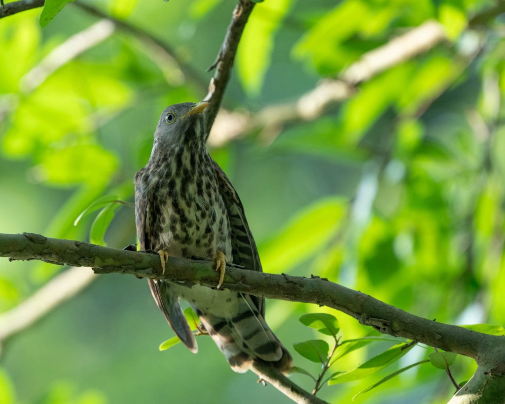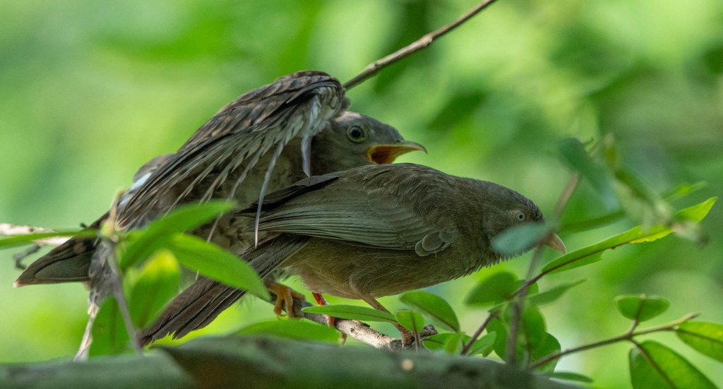 The highlight of this morning’s walk was a common hawk cuckoo chick sitting noisily on a branch and demanding caterpillars from its ‘parents’, a pair of yellow-billed babblers.